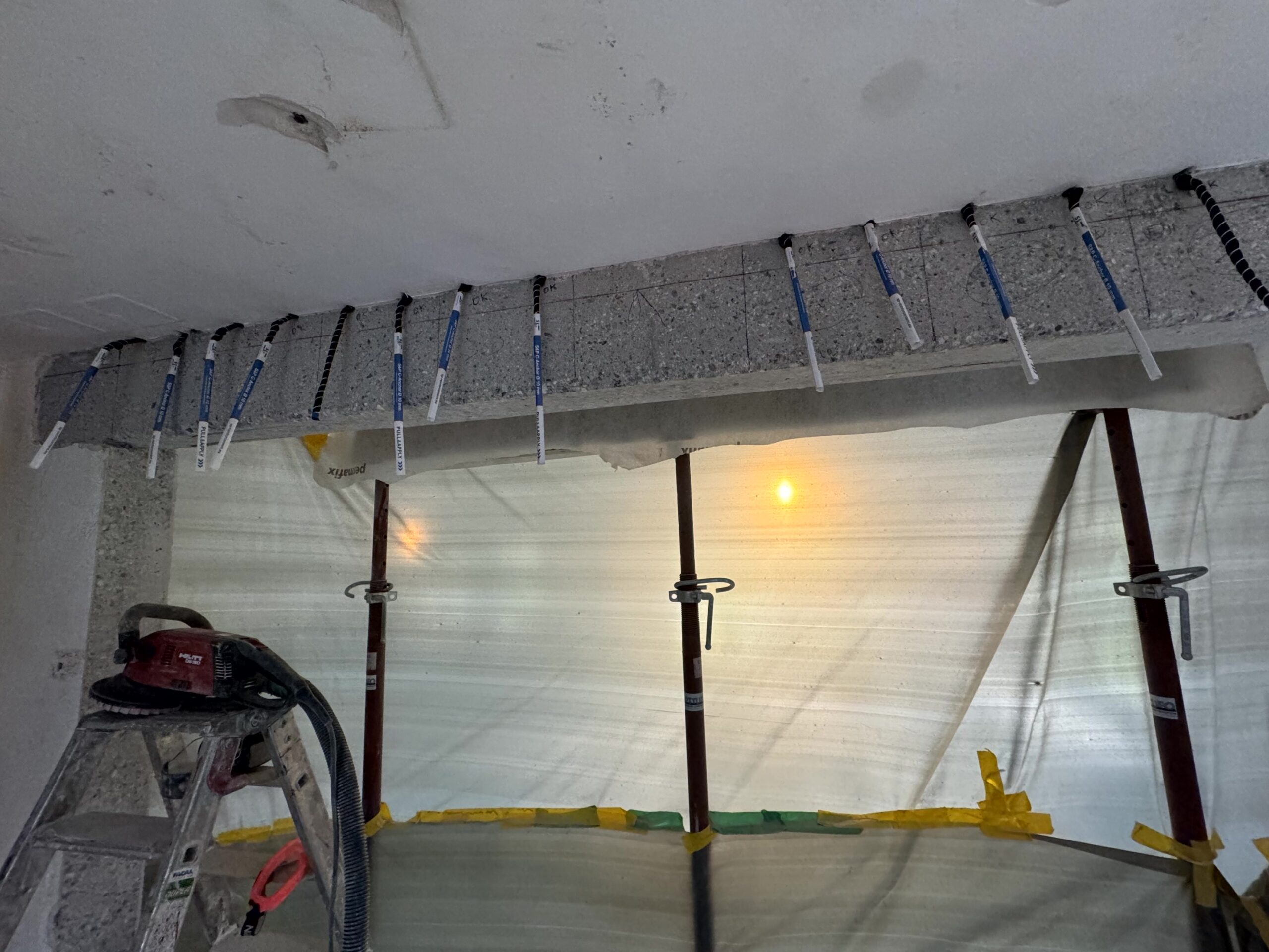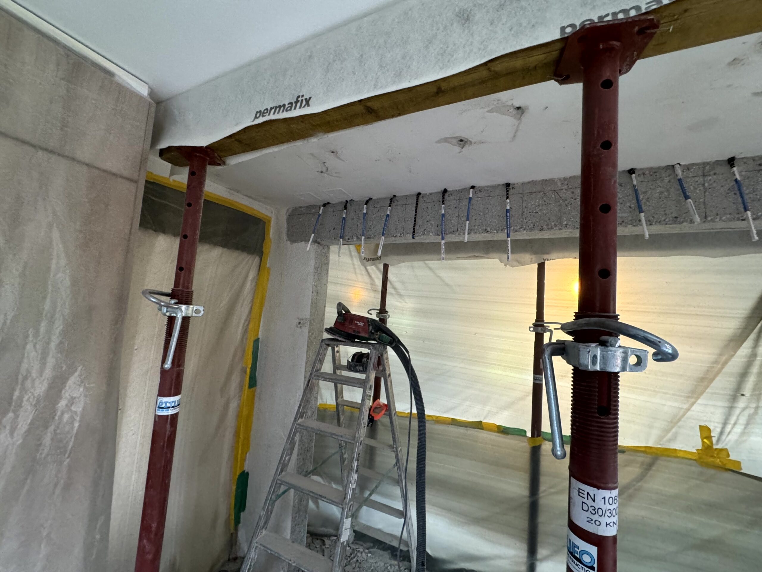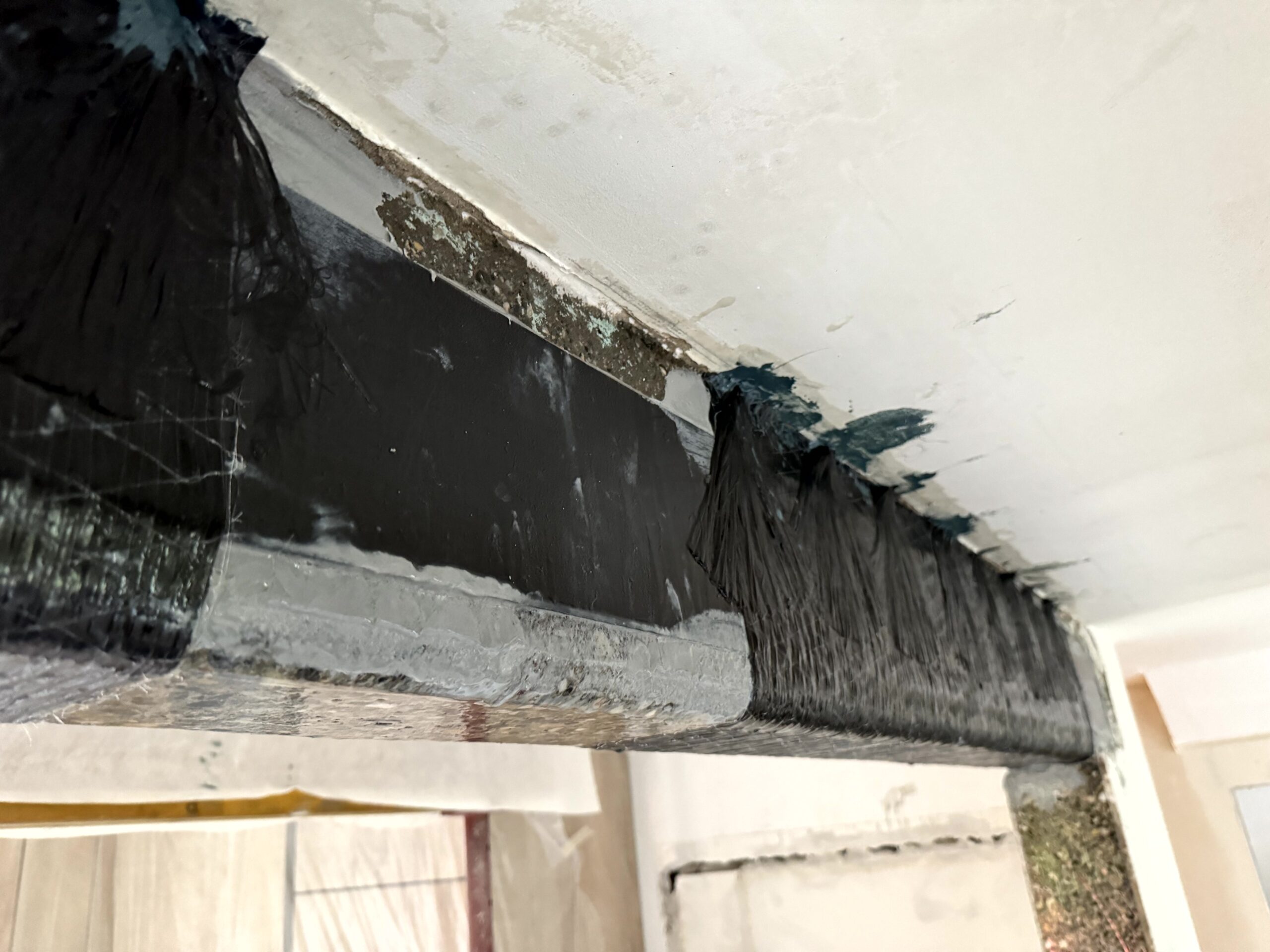 Réalisation d'une ouverture dans un mur porteur en béton armé au rez, entre la cuisine et le salon. Renforcement avec des lamelles carbone.