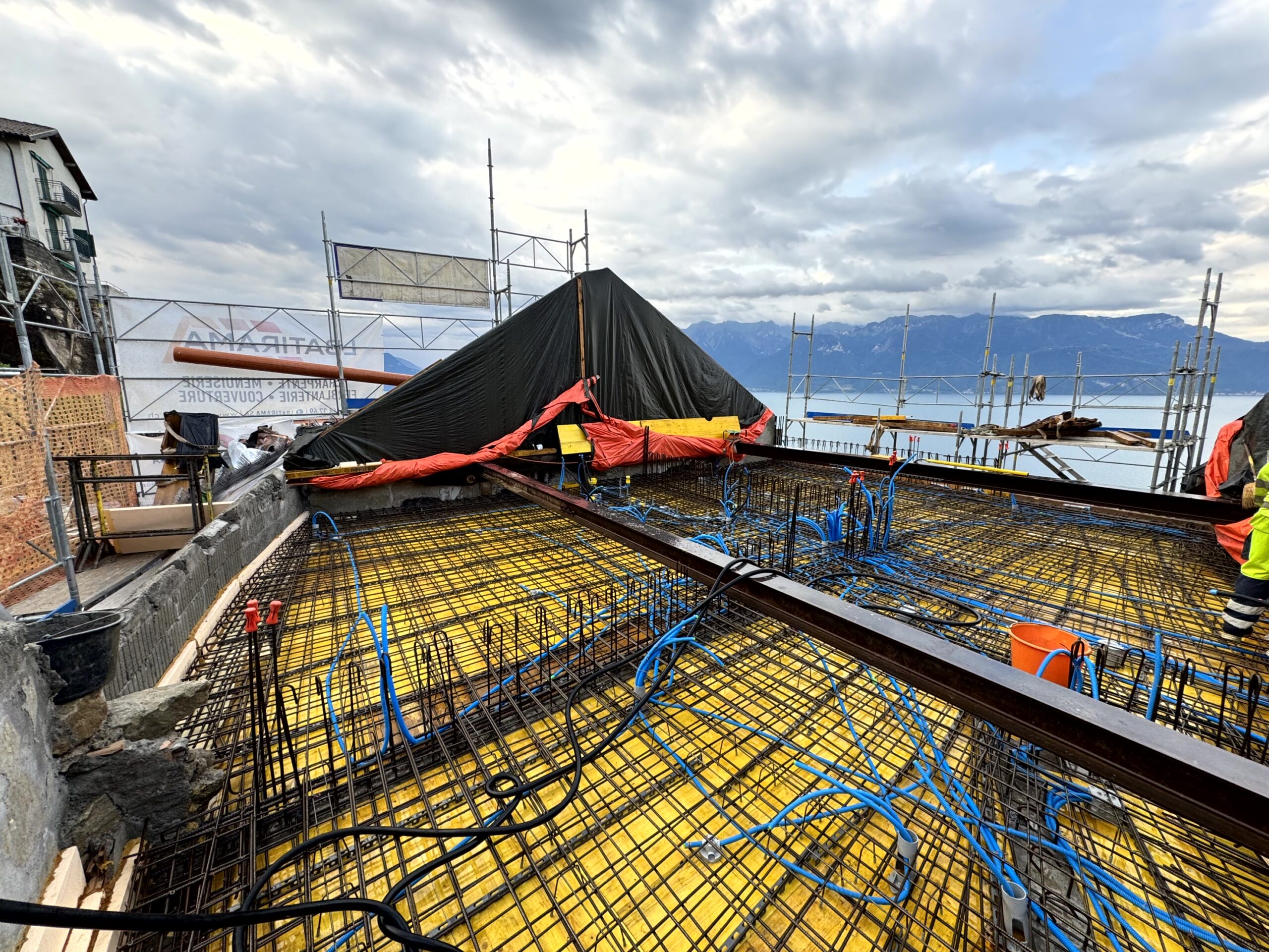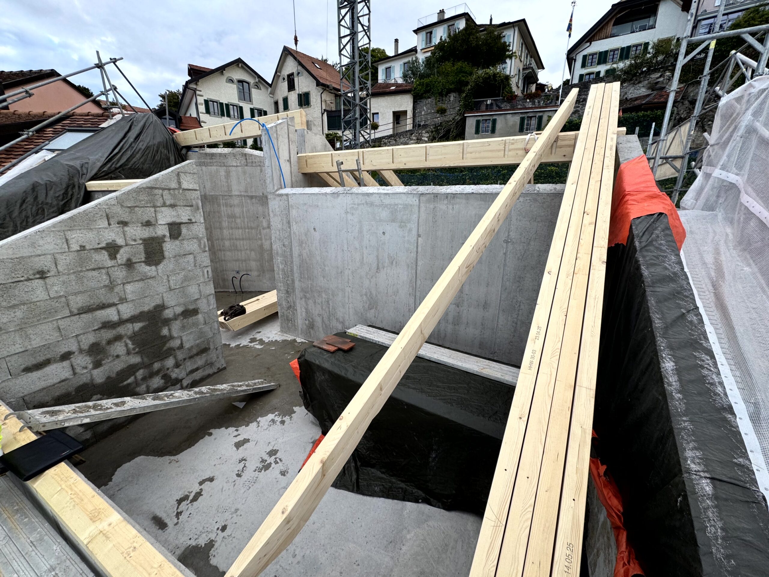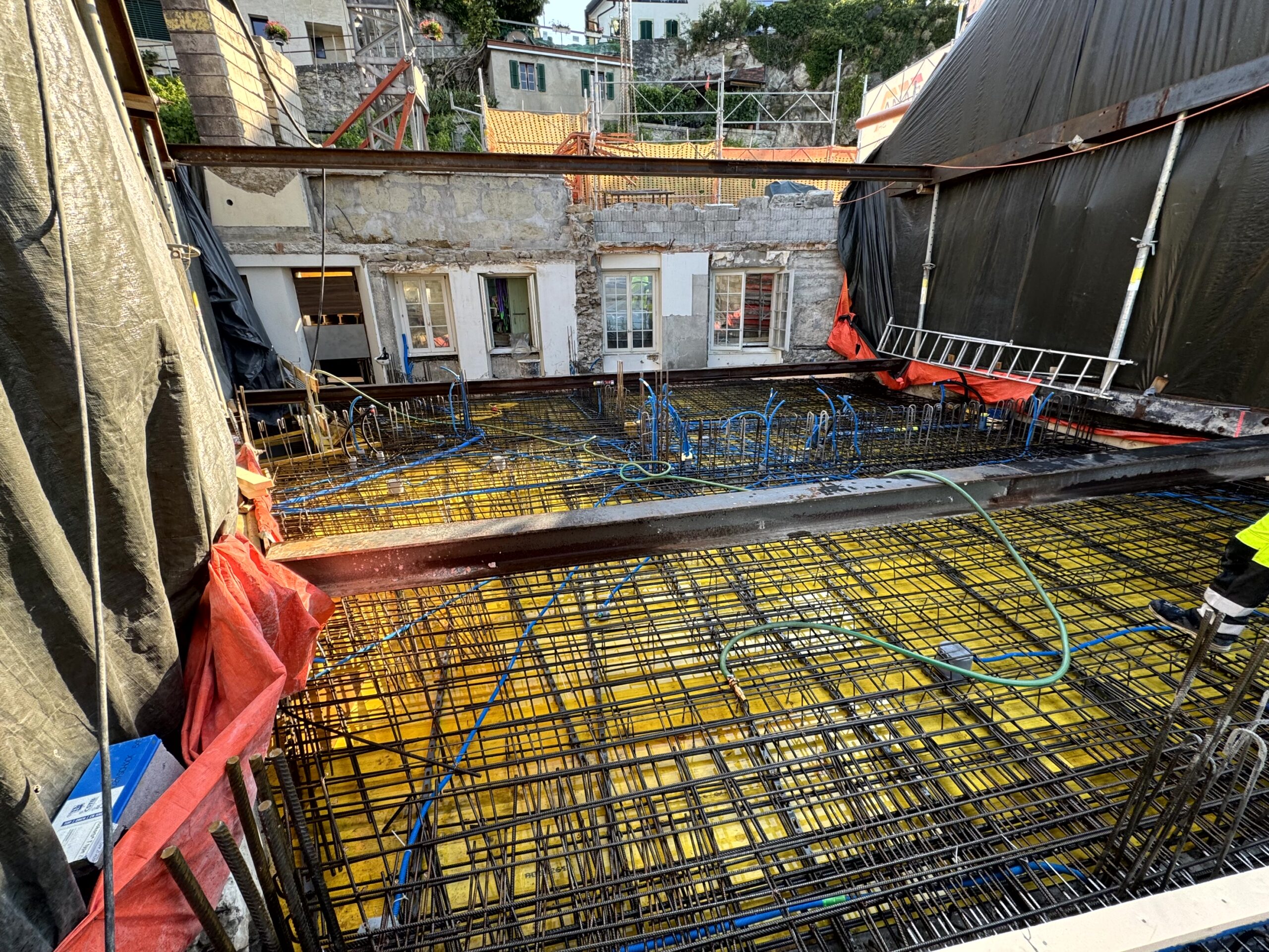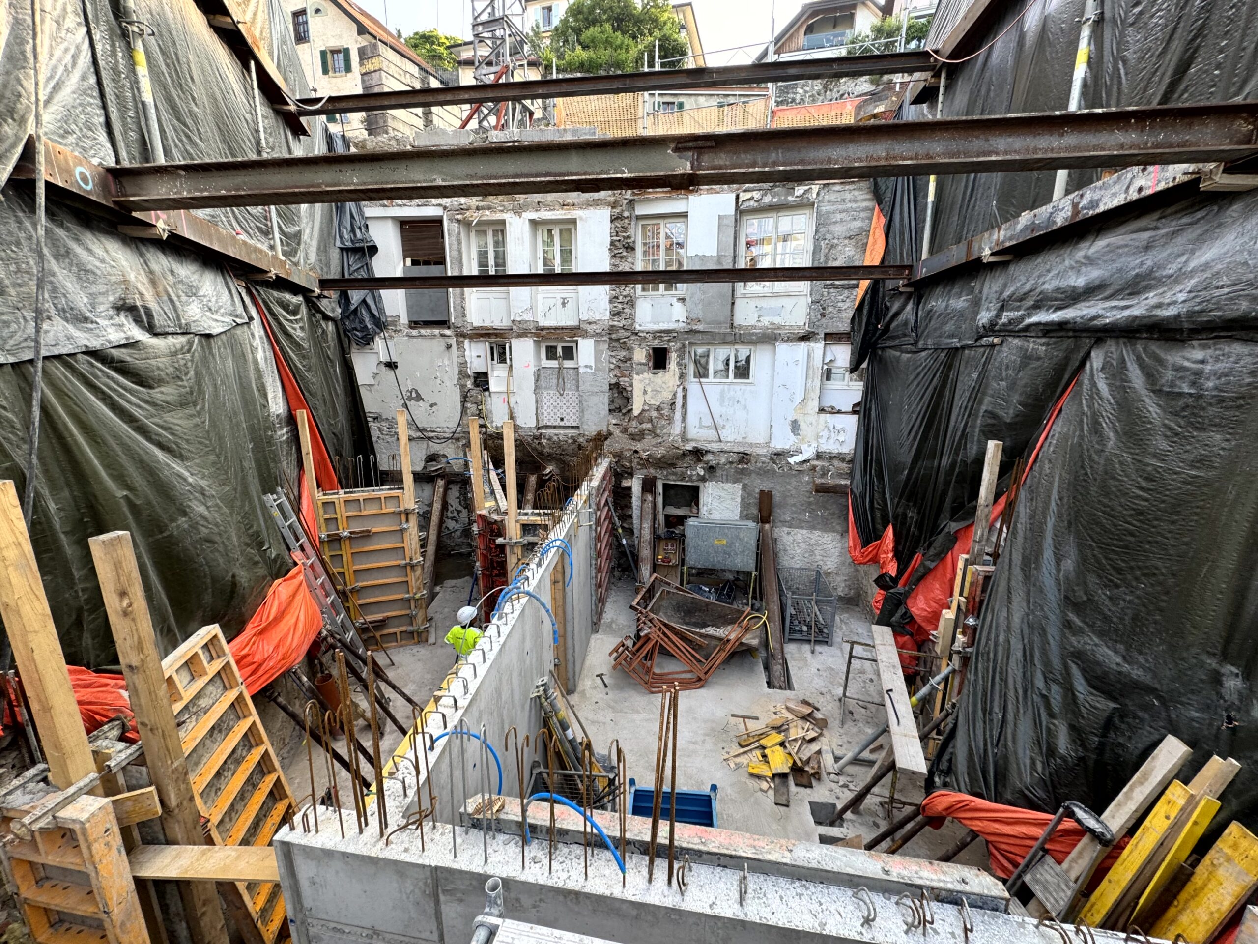 Transformation complète d’un bâtiment d’habitation situé au cœur du quartier de la Grinaz à Chexbres. Les travaux ont consisté en la démolition totale de l’ouvrage existant, implanté entre deux bâtiments mitoyens, impliquant le maintien permanent de leur stabilité ainsi que celle de la route située en amont. Le projet a porté sur la reconstruction intégrale d’un nouvel immeuble en béton armé. L’intervention s’inscrivait dans un environnement urbain dense, générant d’importantes contraintes logistiques et d’exécution, notamment en raison de l’espace très restreint disponible pour l’installation de chantier.