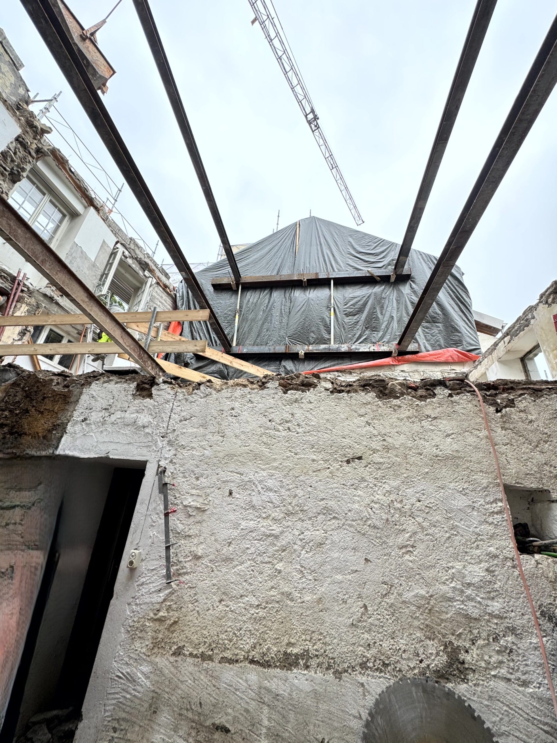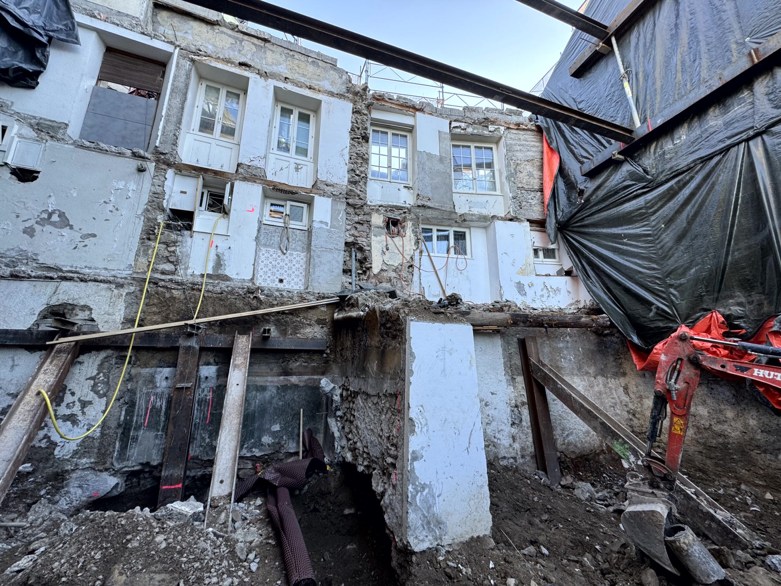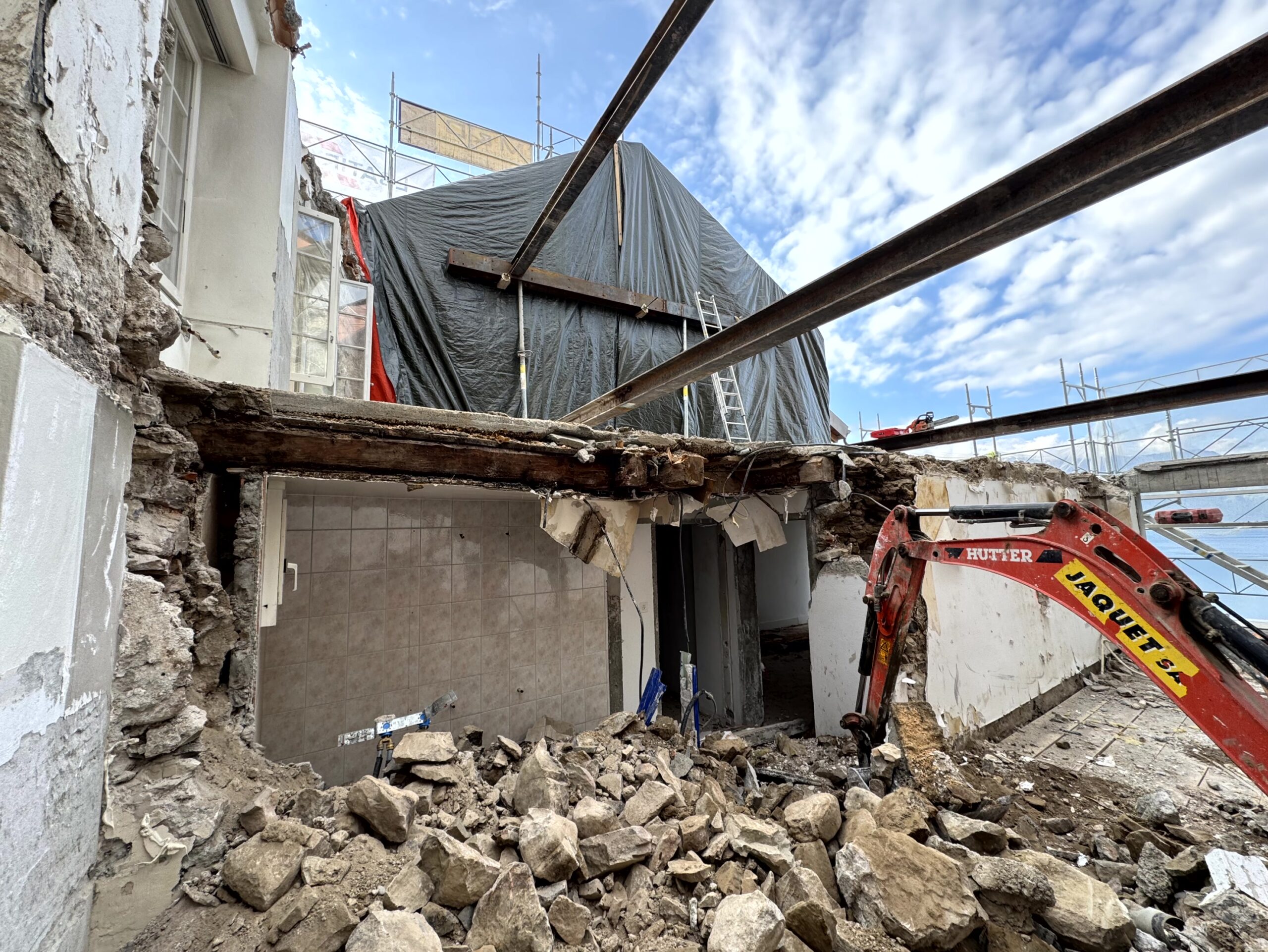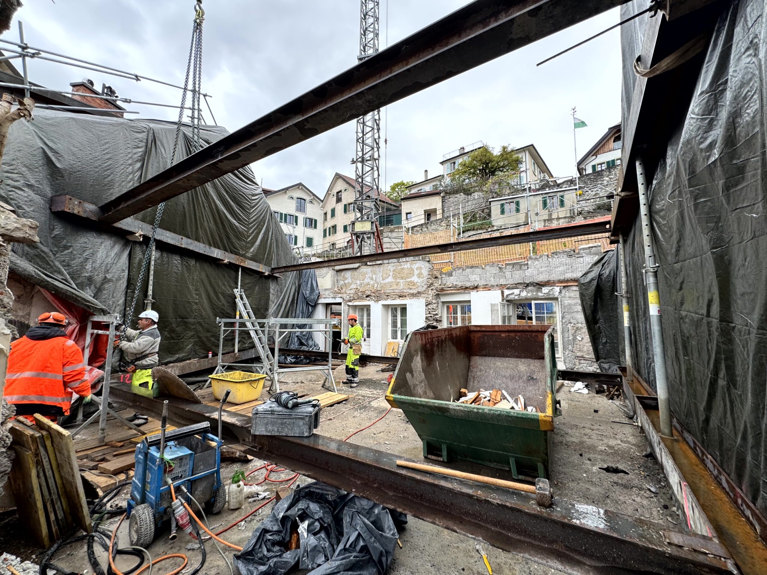 Transformation complète d’un bâtiment d’habitation situé au cœur du quartier de la Grinaz à Chexbres. Les travaux ont consisté en la démolition totale de l’ouvrage existant, implanté entre deux bâtiments mitoyens, impliquant le maintien permanent de leur stabilité ainsi que celle de la route située en amont. Le projet a porté sur la reconstruction intégrale d’un nouvel immeuble en béton armé. L’intervention s’inscrivait dans un environnement urbain dense, générant d’importantes contraintes logistiques et d’exécution, notamment en raison de l’espace très restreint disponible pour l’installation de chantier.